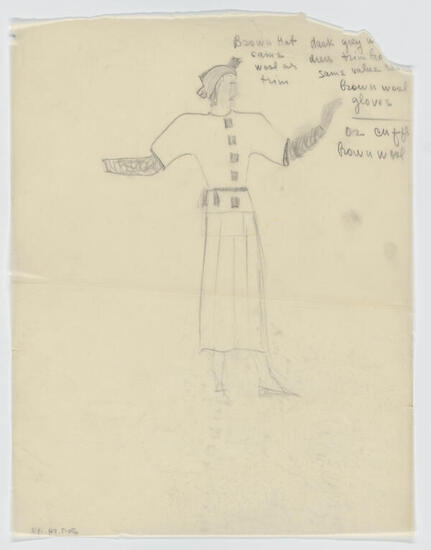 Brown hat, same wool as trim. Dark grey [..] dress trim [...] same value. Brown wool gloves. 02 cuffs, brown wool.