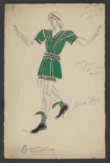 Duvetyn black stripes, dull green […] wool, black shoes.