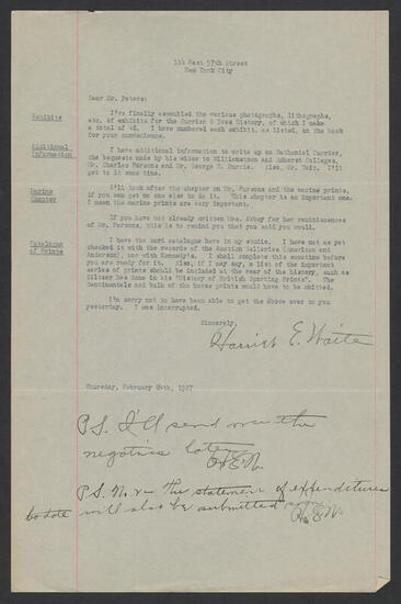 Research by Harriet Endicott Waite for the checklist to "Currier & Ives: Printmakers to the American People", submitted to Harry T. Peters, July 27, 1927