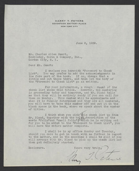 Letter from Charles Allen Smart of Doubleday, Doran & Company, Inc., to Harry T. Peters, April 29, 1929