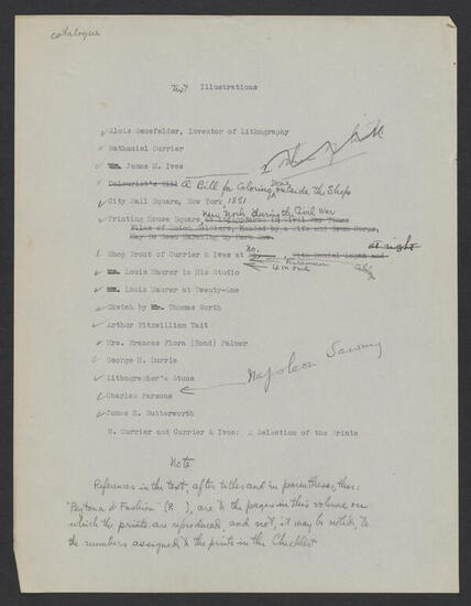 Draft of title page and colophon to "Currier & Ives: Printmakers to the American People"