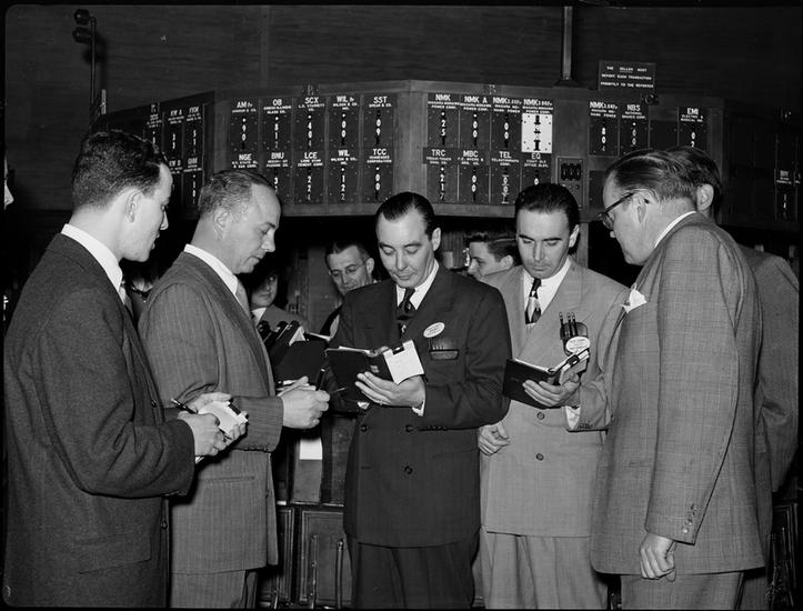 Stock Exchange [Men looking at stock prices on the floor of the stock exchange.]