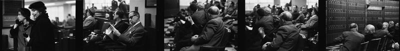 Stock Exchange [Men looking at stock prices on the floor of the stock exchange.]