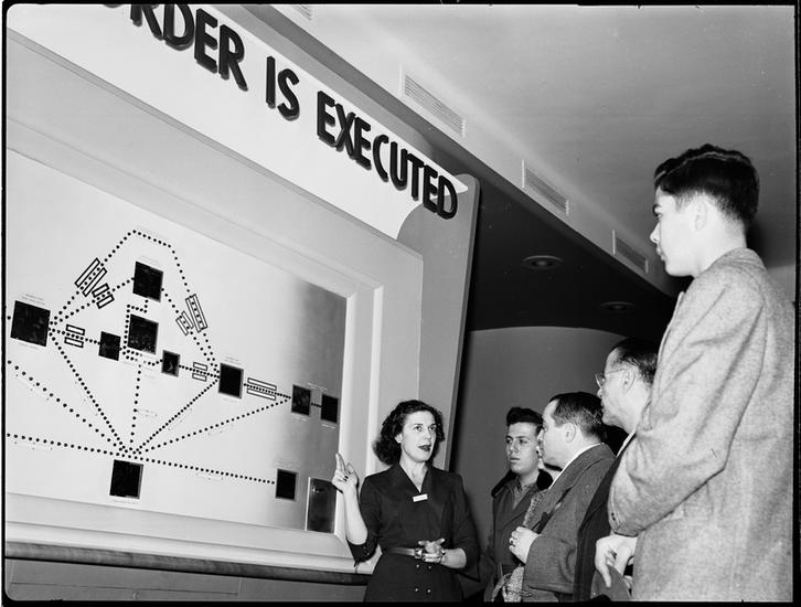 Stock Exchange [Woman giving a tour of the stock exchange, showing a model trading post.]