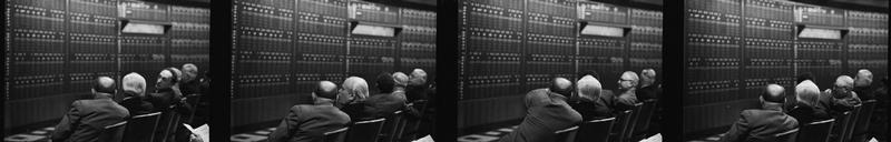 Stock Exchange [Men looking at stock prices on the floor of the stock exchange.]