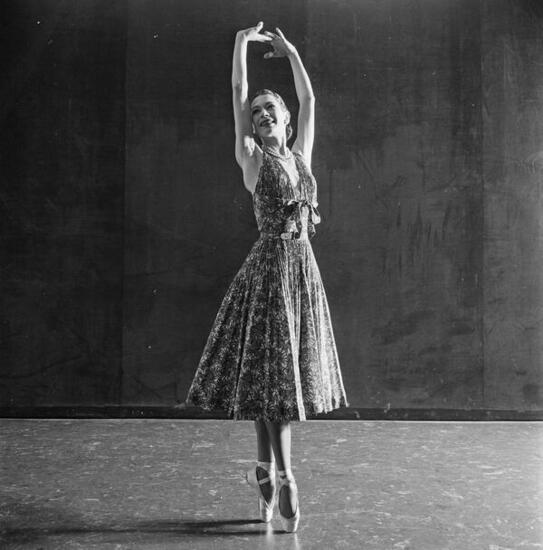 Photographs of ballerinas from New York City Ballet dancing while wearing and holding a variety of costumes, including leotards, dresses, and suits. Date of assignment February 19, 1952. Story published in LOOK on May 6, 1952 pages 98-102.
