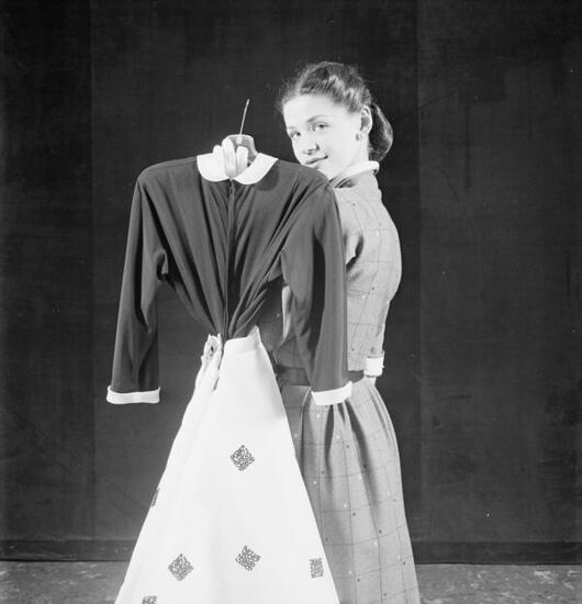 Photographs of ballerinas from New York City Ballet dancing while wearing and holding a variety of costumes, including leotards, dresses, and suits. Date of assignment February 19, 1952. Story published in LOOK on May 6, 1952 pages 98-102.