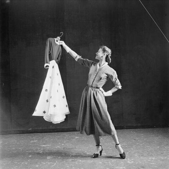Photographs of ballerinas from New York City Ballet dancing while wearing and holding a variety of costumes, including leotards, dresses, and suits. Date of assignment February 19, 1952. Story published in LOOK on May 6, 1952 pages 98-102.