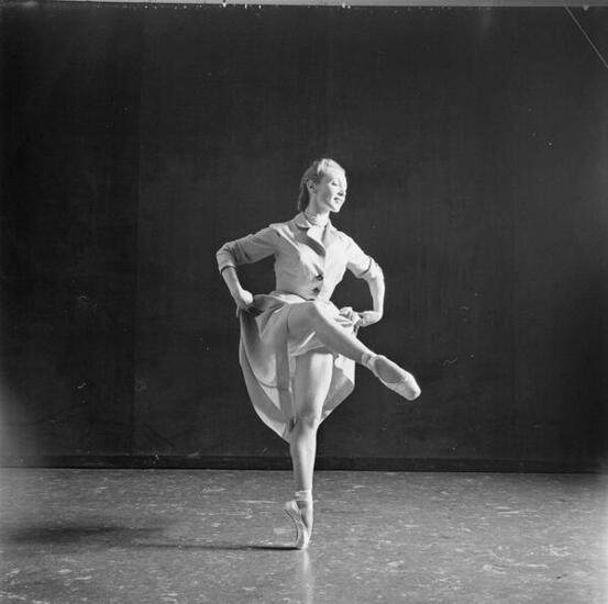 Photographs of ballerinas from New York City Ballet dancing while wearing and holding a variety of costumes, including leotards, dresses, and suits. Date of assignment February 19, 1952. Story published in LOOK on May 6, 1952 pages 98-102.