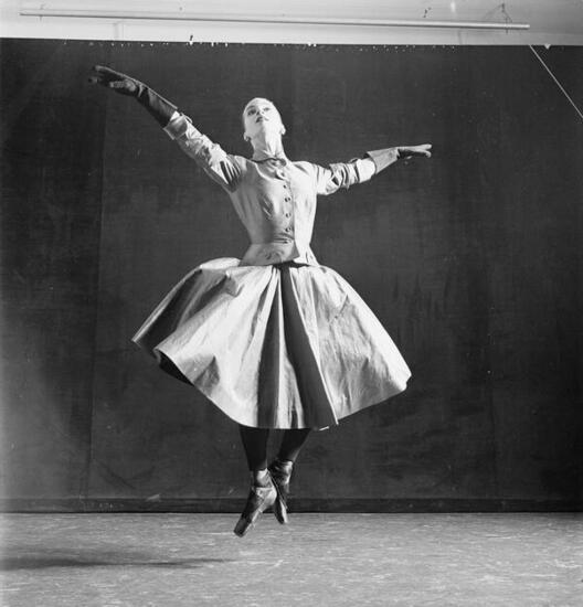 Photographs of ballerinas from New York City Ballet dancing while wearing and holding a variety of costumes, including leotards, dresses, and suits. Date of assignment February 19, 1952. Story published in LOOK on May 6, 1952 pages 98-102.
