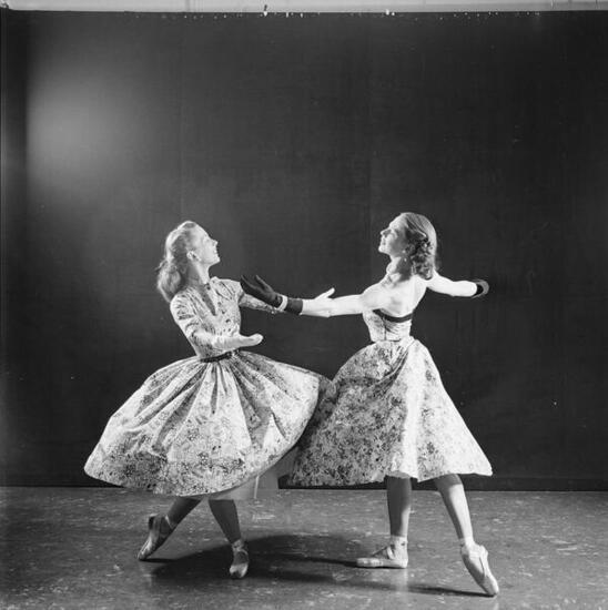 Photographs of ballerinas from New York City Ballet dancing while wearing and holding a variety of costumes, including leotards, dresses, and suits. Date of assignment February 19, 1952. Story published in LOOK on May 6, 1952 pages 98-102.