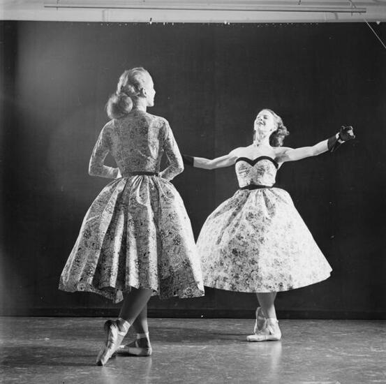 Photographs of ballerinas from New York City Ballet dancing while wearing and holding a variety of costumes, including leotards, dresses, and suits. Date of assignment February 19, 1952. Story published in LOOK on May 6, 1952 pages 98-102.