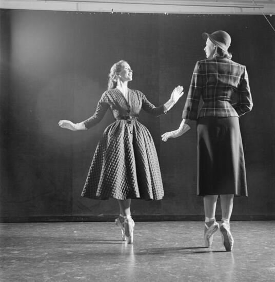 Photographs of ballerinas from New York City Ballet dancing while wearing and holding a variety of costumes, including leotards, dresses, and suits. Date of assignment February 19, 1952. Story published in LOOK on May 6, 1952 pages 98-102.
