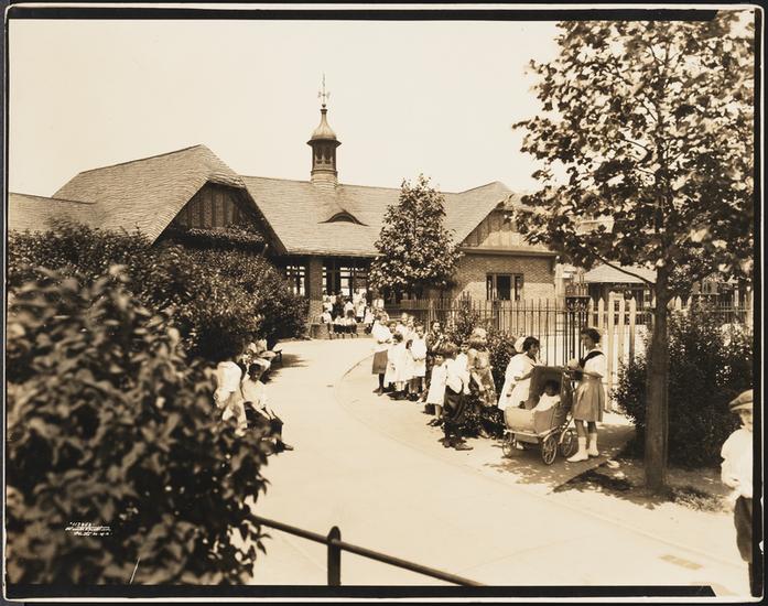 Phipps's Housing, children, boys, children's playground, "Toy War Tank," children, girls "house keeping" sand box.