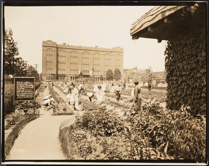 [Hawthorne Court. Apartment entrance and garden with children.]