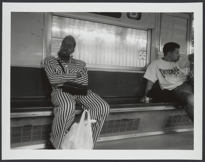 Young woman in striped suit with shopping bag between feet sleeps on subway.