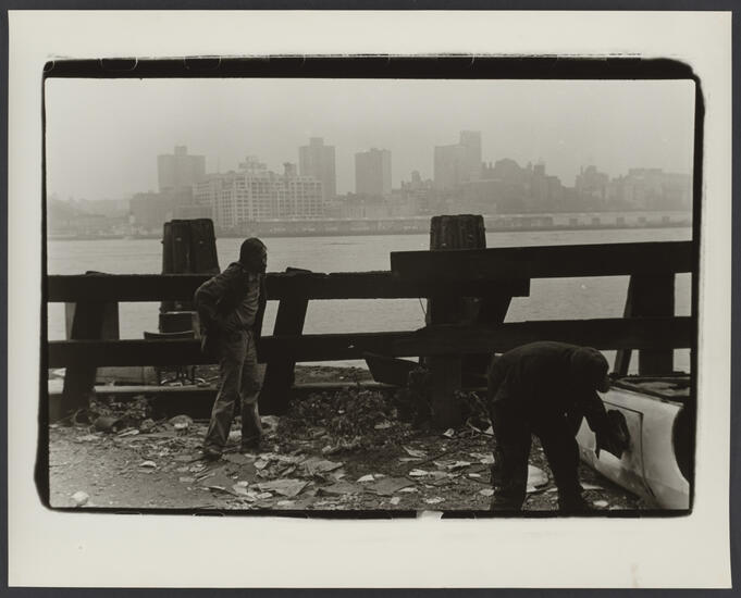 [Destitute men sleeping on East River pier with Brooklyn skyline visible.]