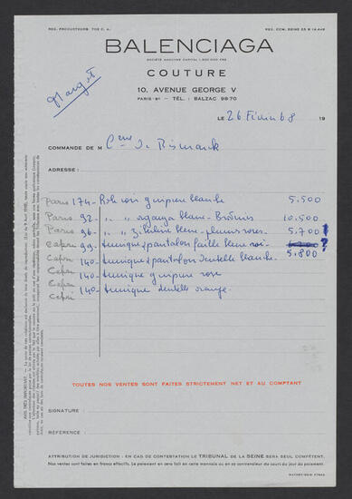 Invoice issued by Balenciaga to Mrs. Harrison Williams, February 26, 1968