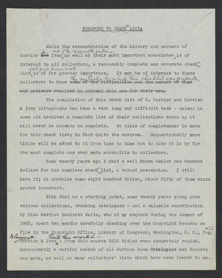 Draft of acknowledgements for "Currier & Ives: Printmakers to the American People"