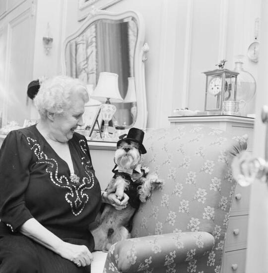 New York Streets--Fifth Avenue [Mrs. Clara Bell Walsh with her dog Spunky at the Plaza Hotel.]