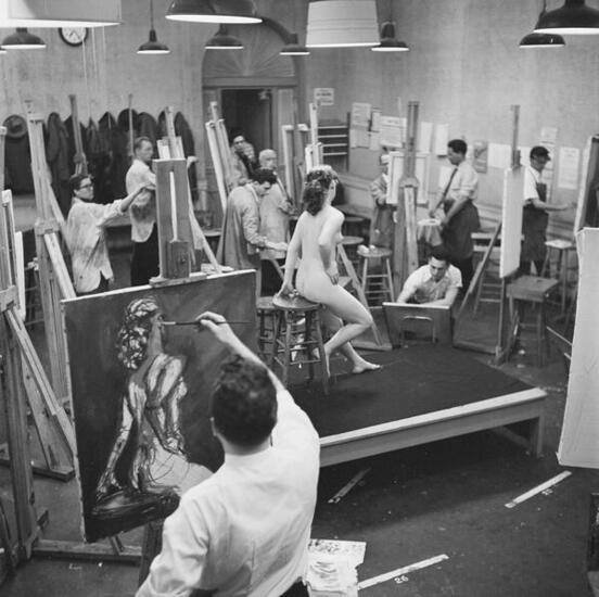 New York Streets--Fifth Avenue [Students at National Academy School of Fine Arts painting model.]