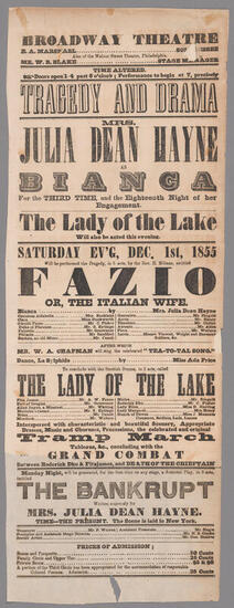 Mrs. Julia Dean Hayne will perform the celebrated character of "Bianca" this evening, Wednesday, November 14, 1855, in "Fazio; or, The Italian Wife"