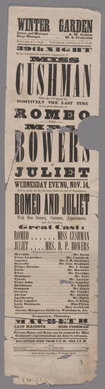 Friday, October 30, 1857, Shakespeare's play in five acts, of "Romeo and Juliet". Miss Cushman will sustain her popular character of Romeo