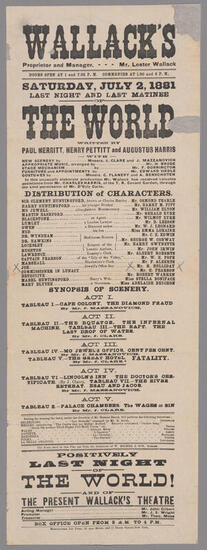 Tuesday, April 12, 1881, a new sensational and realistic drama in five acts and eight tableaux, entitled "The World"