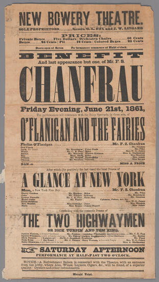 Thursday evening, January 31, 1861, the performances will commence with the beautiful three-act Irish drama of "O'Flanigan and the Fairies"