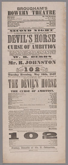 Wednesday evening, May 13, 1857, a new hippodramatic spectacle in four acts, arranged and adapted by John Brougham, called "The Devil's Horse; or, The Curse of Ambition"