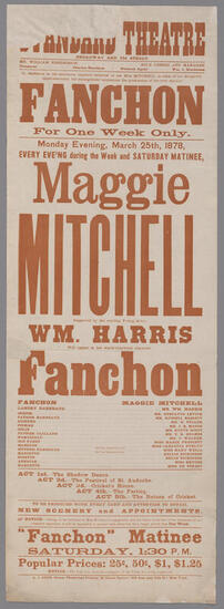 Monday evening, March 18, 1878, every evening during the week and Saturday matinee, Maggie Mitchell supported by Wm. Harris as Wilhelm Meister, in "Mignon"