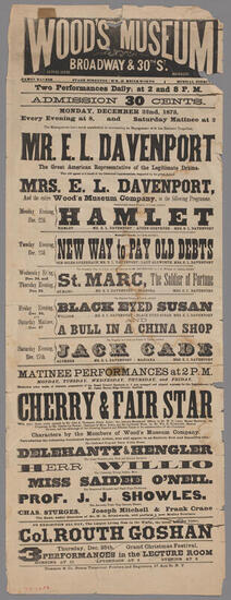 Monday, December 28, 1874. Immense attraction for the New Year holidays. Every evening and Wednesday and Saturday matinees, Dion Boucicault's great local drama, "After Dark"