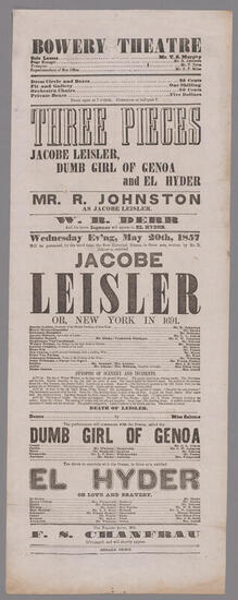 Monday evening, May 18, 1857 will be presented an entire new historical drama in three acts, written by Mr. R. Johnston, called "Jacobe Leisler; or, New York in 1691"