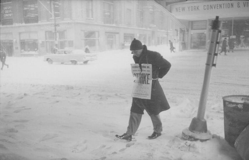 Photographs of members of the Maritime Union standing on a snowy street holding strike signs. Also depicts the interior of a mostly empty Grand Central Station, with several signs stating that train service is annulled due to crews' refusal to cross union picket lines.