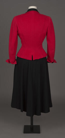 "Sissy Suit" in cherry red wool fleece and black wool twill