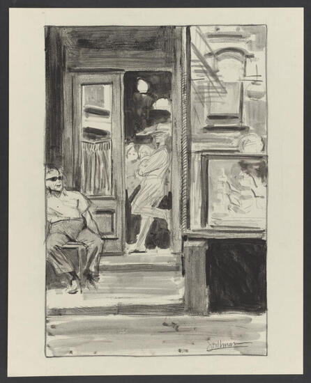 Untitled [Dinner scene with two men in booth with coffee cups]