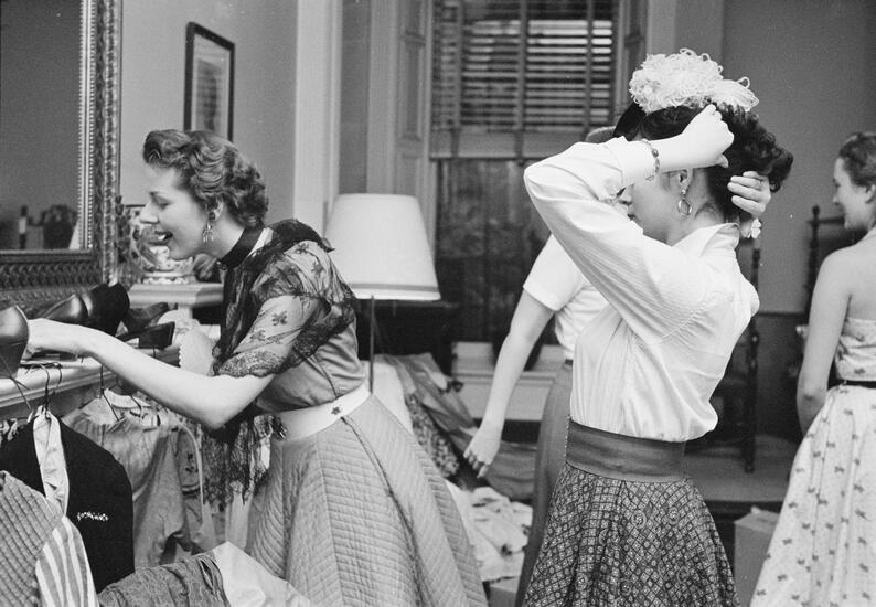 Photographs taken at the Rehearsal Club, a boarding house for young women pursuing a career in theater. Depicts residents standing on the front steps of the brownstone building located on West 53rd Street; posing for individual portraits; spending time in their shared bedrooms; and working at their jobs in nightclubs, dance studios, and theaters.