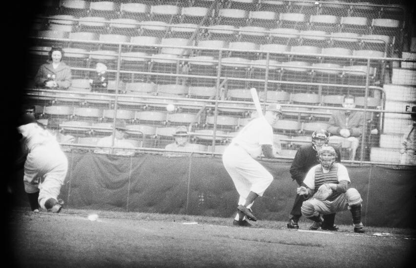 Photographs of Duke Snyder and other players for the Brooklyn Dodgers playing a baseball game in a mostly empty stadium.