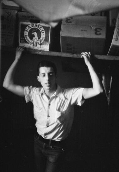 Photographs of people and places in Brooklyn associated with the four teenage boys known as the Brooklyn Thrill Killers. Depicts a grocer, a women working at a soda shop, a dry cleaner, a couple on a bench, a man on the beach under the Manhattan Bridge, a woman in an apartment, and teenagers walking down a street.