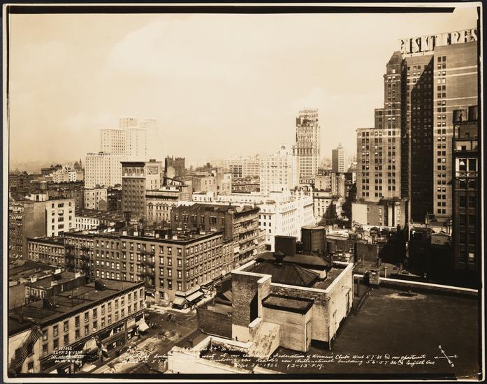 250 West 54 St New York City. From roof of building S.E. Corner 51 St and Broadway looking North-west. Showing vacant electric sign on roof on 250 West 54 St also neighboring new theatre and office bu