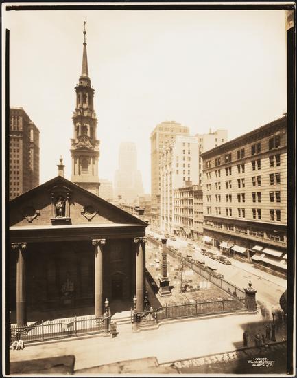 Fulton Street and Broadway.Telephone and Telegraph Building. Elevated view from St. Paul's Chapel