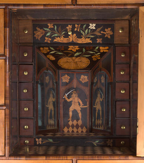 Cabinet-on-stand with veneer and floral marquetry of walnut, kingwood, olive, holly, rosewood, satinwood, other tropical hardwoods, stained bone and oak, mirrors, replacement brass and iron hardware and turned wooden knobs. On original carved lion's paw feet, and accessioned with two keys.