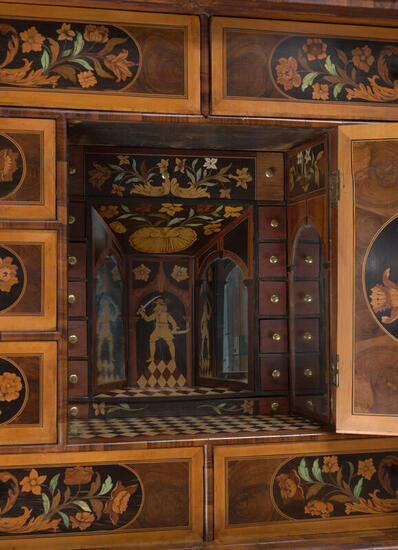 Cabinet-on-stand with veneer and floral marquetry of walnut, kingwood, olive, holly, rosewood, satinwood, other tropical hardwoods, stained bone and oak, mirrors, replacement brass and iron hardware and turned wooden knobs. On original carved lion's paw feet, and accessioned with two keys.