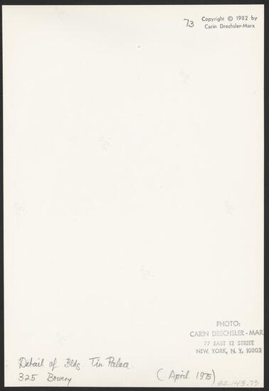 DETAIL OF BLDG. TIN PALACE, 325 BOWERY (APRIL 1975)