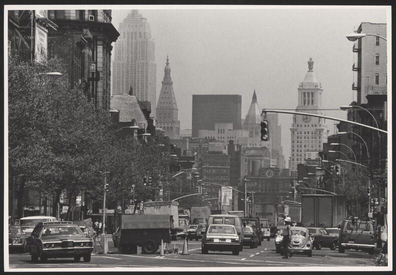 Description View of a street with heavy traffic and skyscrapers in the distance. A woman in a hard hat can be seen crossing the street in the foreground. The Consolidated Gas Company Building (right, with clock tower) can be seen in the background.