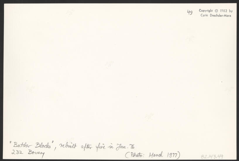 "BUTCHER BLOCKS," REBUILT AFTER FIRE IN JAN. 76, 232 BOWERY (PHOTO: MARCH 1977)