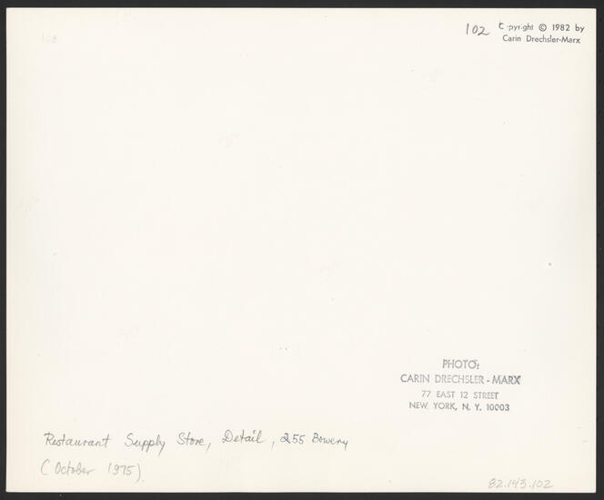 RESTAURANT SUPPLY STORE, DETAIL, 255 BOWERY (OCTOBER, 1975)