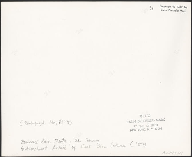 BOUWERIE LANE THEATRE, 330 BOWERY, ARCHITECTURAL DETAIL OF CAST IRON COLUMNS, 1874 (PHOTOGRAPH: MAY 8, 1975)