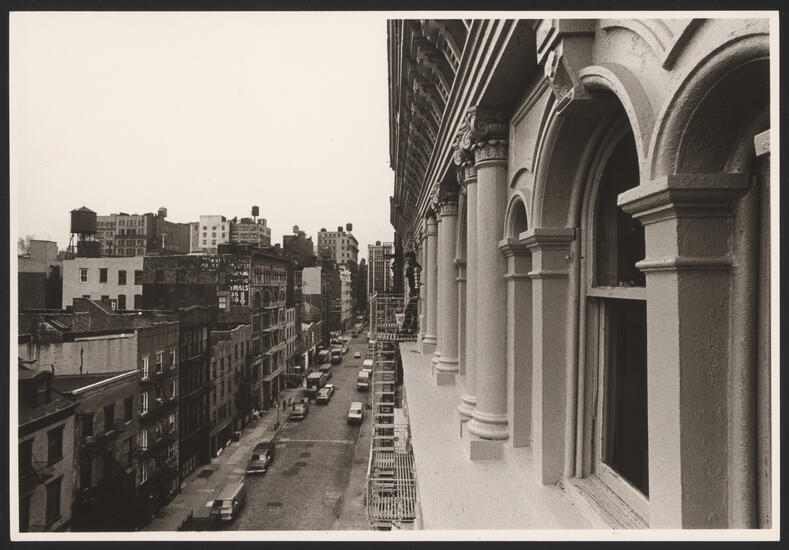 Description View from the fire escape of a building with columns and arched windows. A man can be seen on a fire escape in the distance. The street with buildings and cars can be seen below.