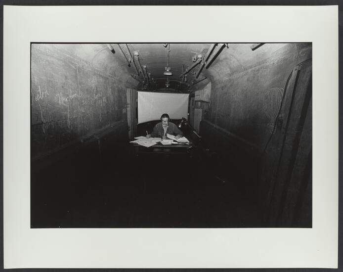 John Cage writes at a desk in a baggage car at Grand Central Terminal during the Avant Garde Festival, New York